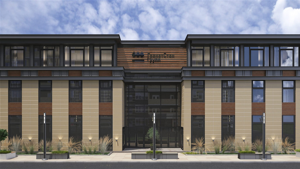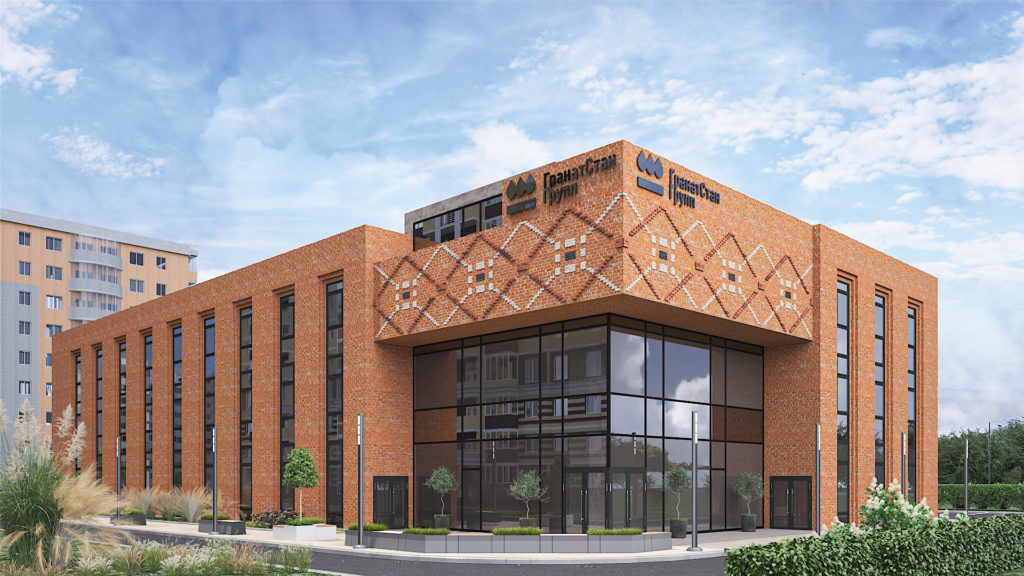 Первая версия проекта офисного здания в г. Альметьевск. Выполнен комплексный проект с дизайном интерьеров и благоустройством